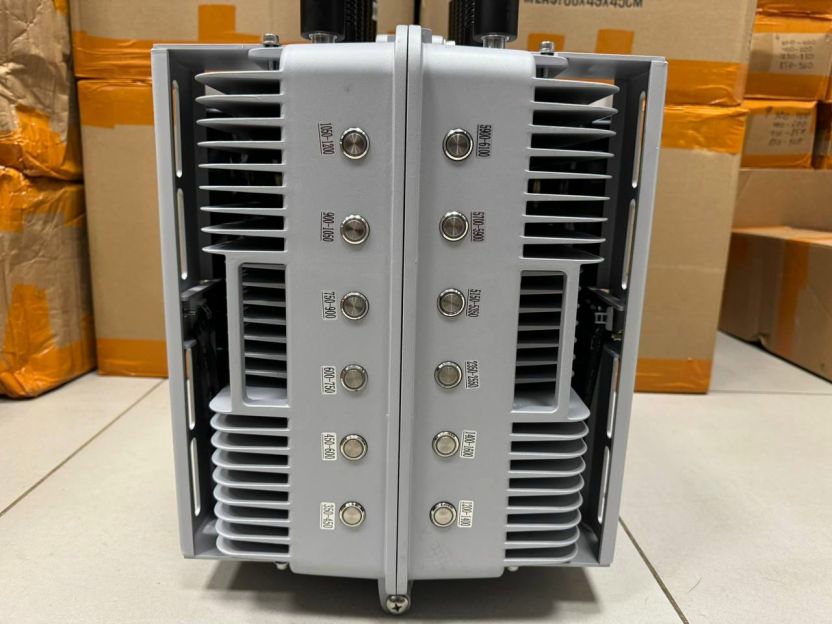 Диапазон подавляемых частот: 350-450, 450-600, 600-750, 750-900, 900-1050, 1050-1200, 1200-1400, 1400-1600, 2400-2585, 5150-5350, 5725-5850, 5900-6100. Имeeт coвoкупную мощность 600w.